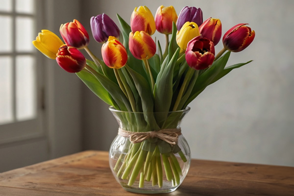 Per mantenere la bellezza di un bouquet di tulipani colorati il più a lungo possibile, è fondamentale seguirne attentamente la cura. Innanzitutto, è importante tagliare i gambi in diagonale, per permettere ai fiori di assorbire più acqua.